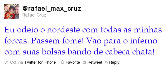 Junto com o resultado das últimas eleições gerais no Brasil, finalmente a máscara do preconceito caiu, estando completamente nu e mostra todas as suas garras possíveis. E infelizmente, atitudes eles mostraram sua força total nas redes sociais, a partir do momento que foi divulgado o resultado, confirmando a vitória da Dilma Rousseff. Com isso, houve uma intensa onda de manifestações preconceituosas contra o povo nordestino, incitando ódio e violência contra os mesmos.
